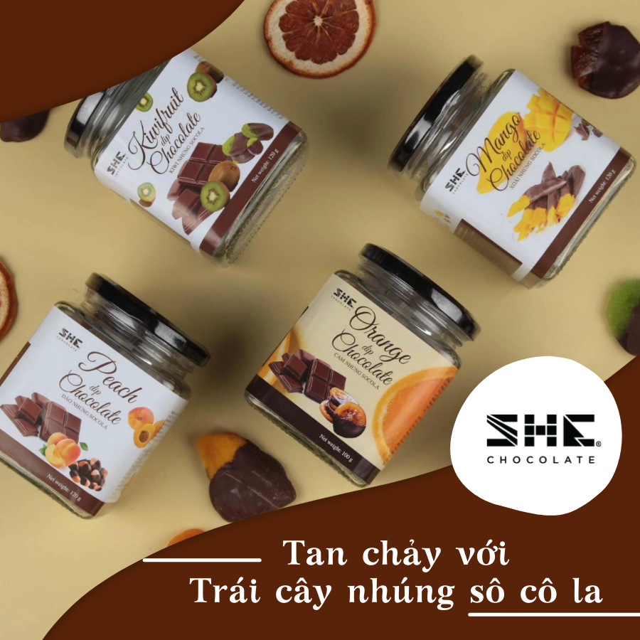 Tại SHE, có đa dạng các loại trái cây sấy nhúng socola với màu sắc bắt mắt, hương vị ngọt thanh – chua nhẹ đầy kích thích của những lát trái cây sấy dẻo như: xoài, cam, kiwi, đào,… hòa cùng chút vị ngọt dịu dàng của socola . Đây chắc chắn sẽ là món ăn khiến gia đình bạn hay bất cứ vị khách nào ghé thăm cũng đều say mê thưởng thức và tấm tắc khen ngon.