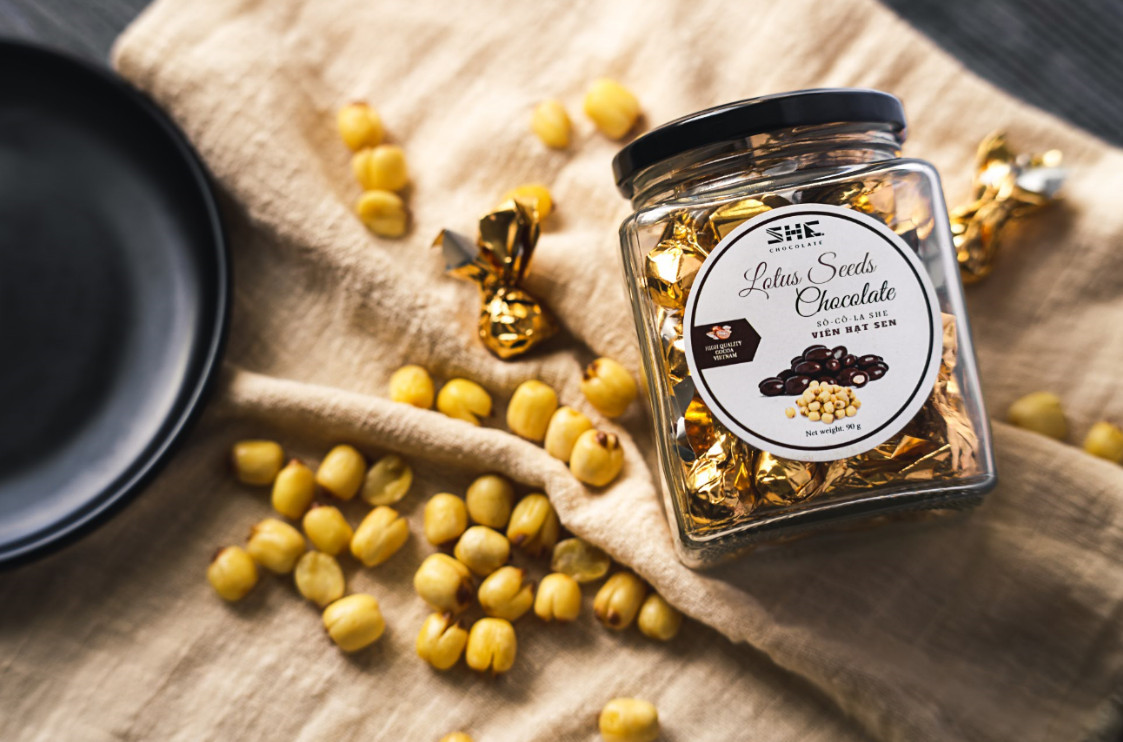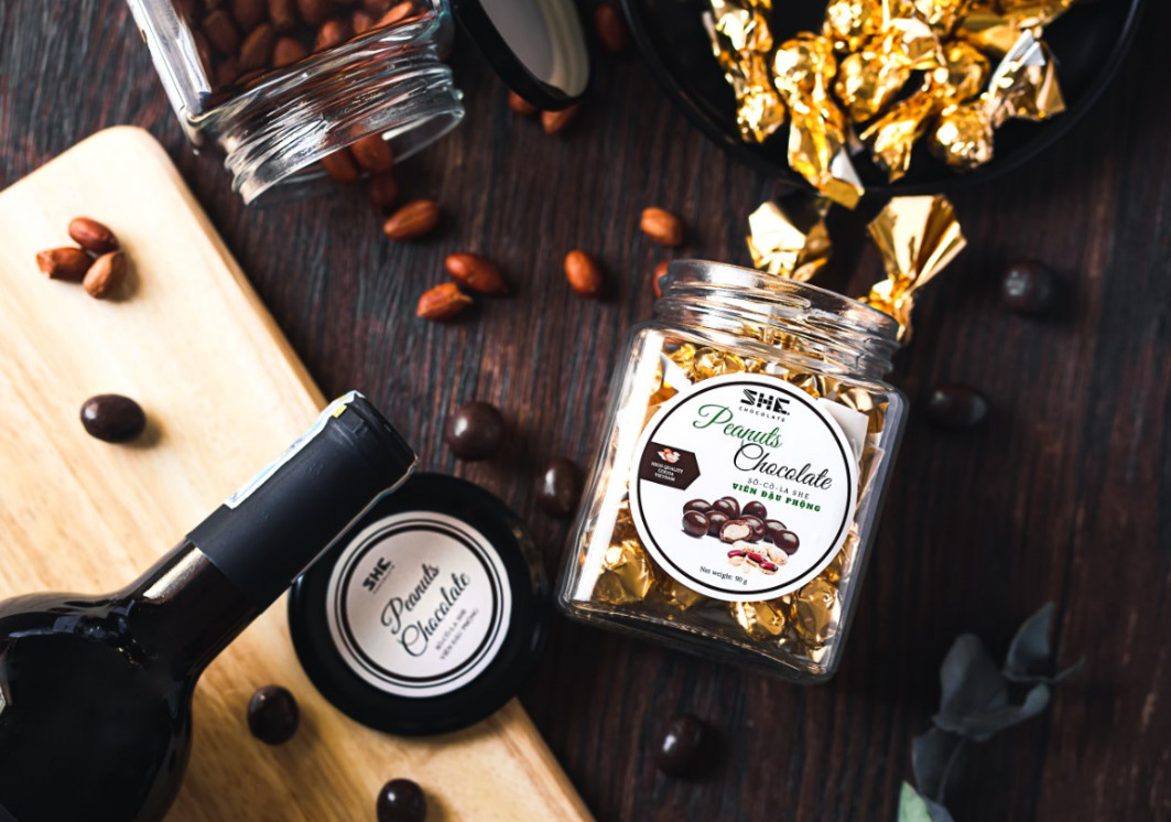 SÔ-CÔ-LA SHE VIÊN ĐẬU PHỘNG – Peanuts Chocolate Socola Đậu phộng to, tròn đều. Đậu phộng sau khi rang chân không màu vàng tươi, có vị ngọt nhẹ, bùi, thơm và độ giòn đặc biệt. Kết hợp cùng socola đen SHE, socola tan trong miệng cùng âm thanh rồm rộp giòn tan của đậu phộng.